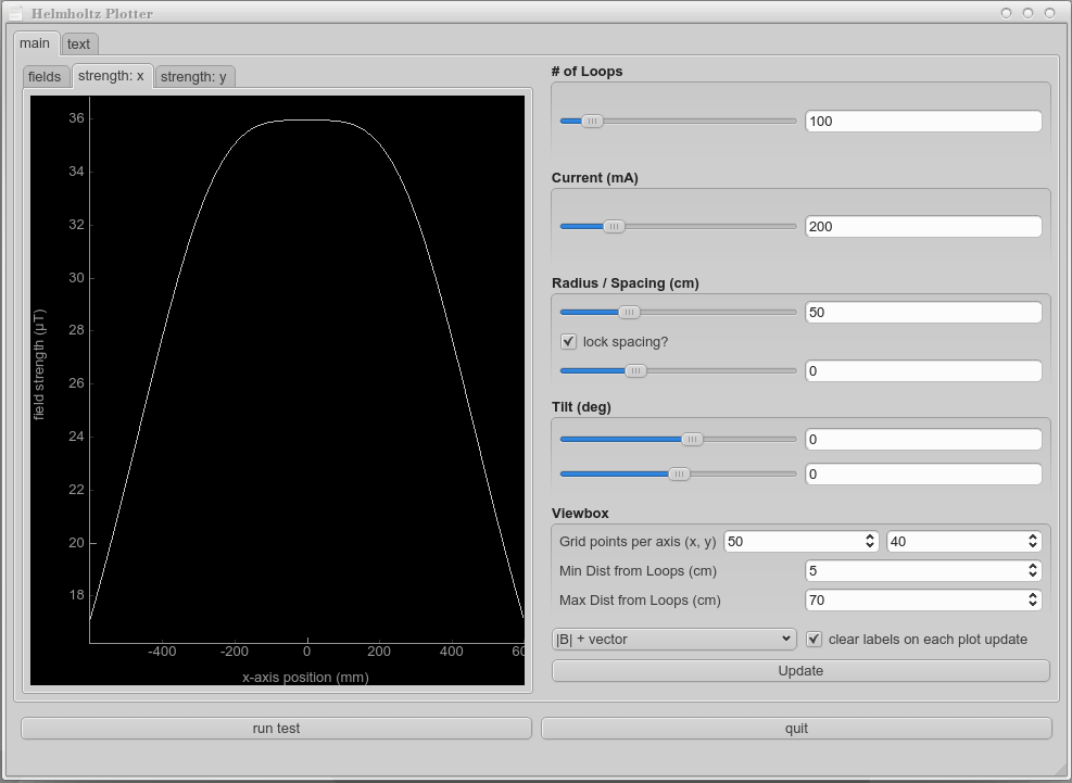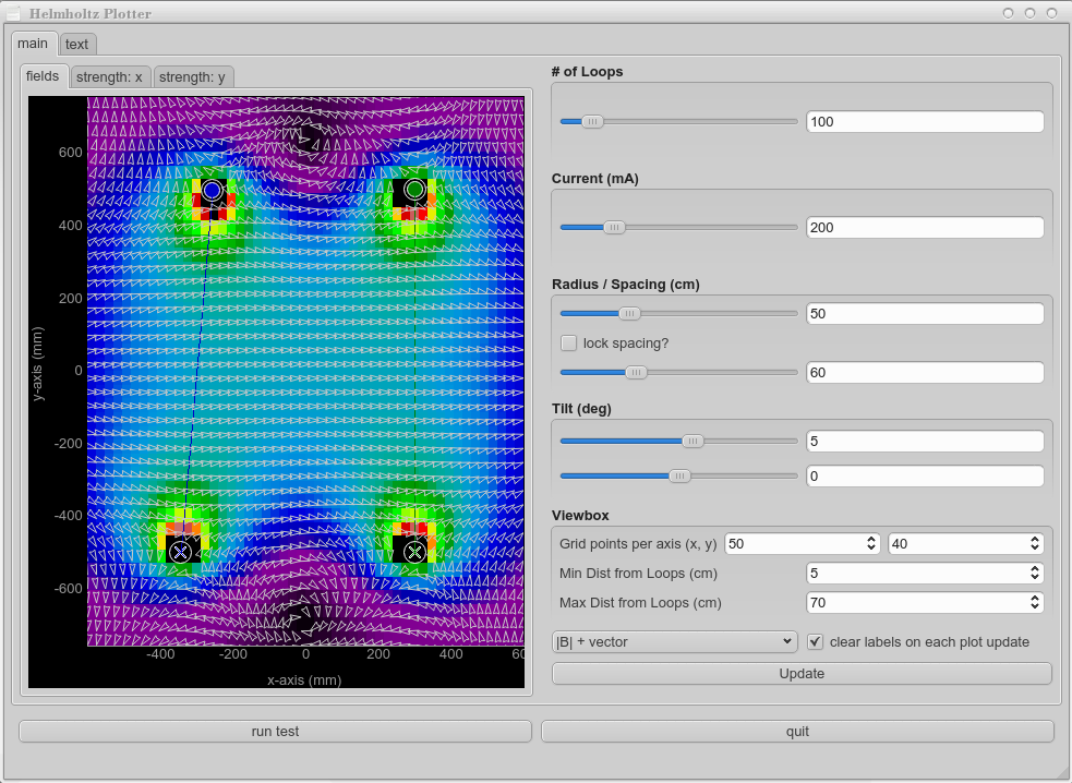 Provides a graphical user interface for visualizing a pair of helmholtz coils. Also provides interactive sliders and inputs to help design coils for a particular use.